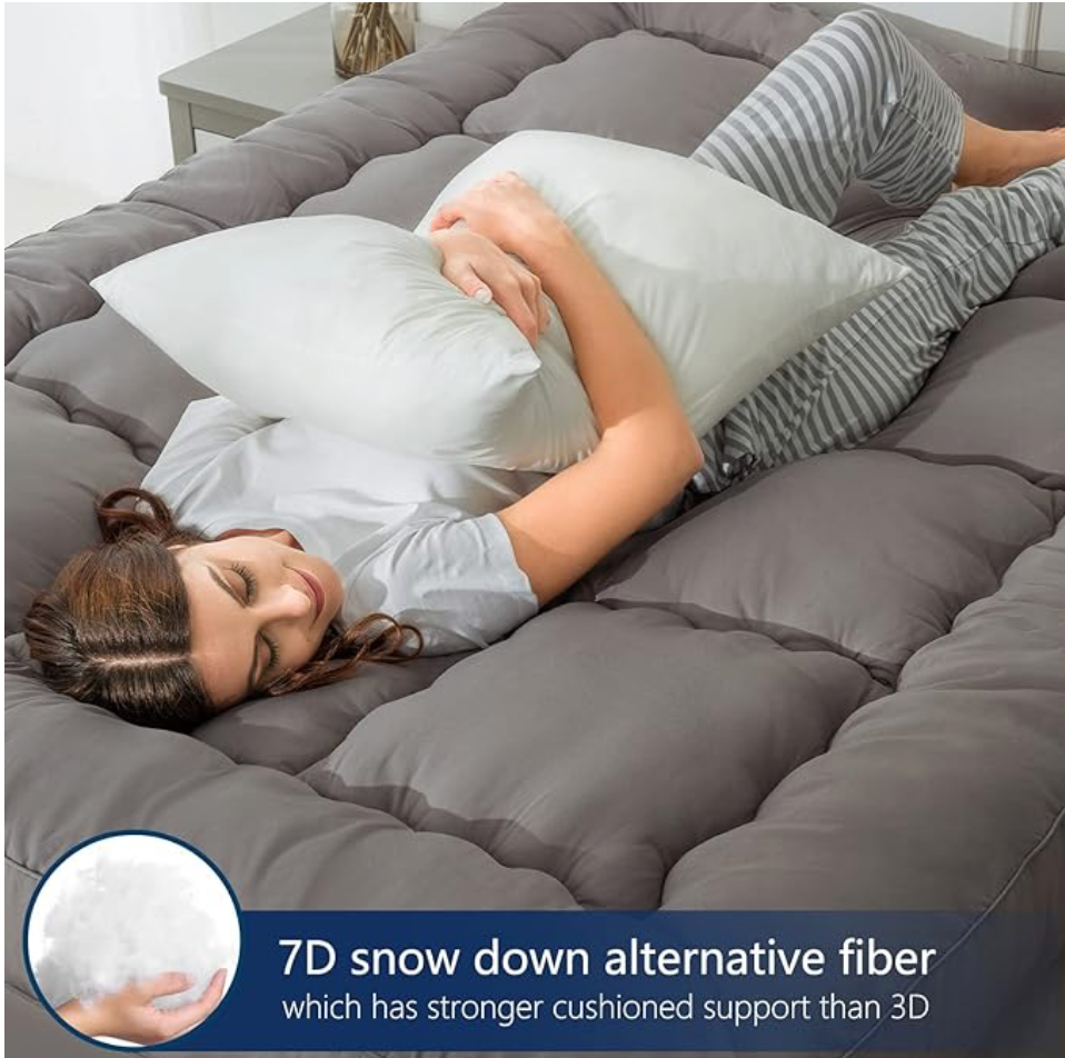 This fitted mattress topper is an upgraded design that fits your entire mattress just like a fitted sheet. It also features a double border pillow top Construction technology, with the overfilled plush down-alternative that is 50% thicker than normal mattress pillow topper available in the market.